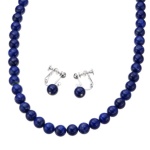 約8mmのラピスラズリを使った、ネックレスとイヤリングまたはピアスのセットです。宇宙から見た地球を連想させるような深い青色が、シックな大人の女性を演出。