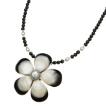 牛の角を使用したツートーンのお花に、黒蝶真珠をあしらった可愛らしいペンダントブローチ。丸珠のブラックカルセドニーを繋いだネックレスに、牛の角と黒蝶真珠で仕上げたフラワーモチーフのヘッドをあしらいました…