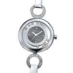 文字盤に煌びやかなクリスタルガラスを散りばめた、ポップでエレガントな腕時計。本体部分が大きめで厚みのある、流行のデザインです。