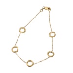 5つのサークルパーツをバランスよく配した、18Kイエローゴールドのステーションブレスレットです。パーツとパーツの絶妙な間隔が、着けたときにお手元を美しく印象付けます。