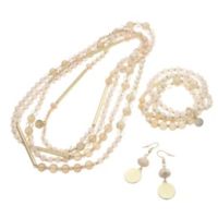 優しい色合いの同系色でデザイン。統一感があってコーディネートしやすい3点セットです。肌馴染みがよく、使い勝手の良い、茶色、ベージュ系のパーツを使用。ネックレスは、ゴールドカラーの棒状のパーツがアクセント。ピアスはあえてシンプルなデザインにして、丸いゴールドカラーのパーツで優しい雰囲気に。ブレスレットにはストレッチのシリコンゴムを使用することで、着脱もラクになっています。