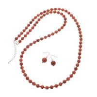 ラウンドシェイプのパッションコーラルを連ねた、ロングネックレスとイヤリングまたはピアスのセットです。
