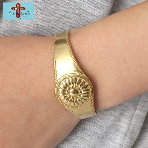 NY発の大人気ブランド「chibi jewels」のインパクトのあるコンチョモチーフをあしらったバングル。太めのバングルで存在感が有りますが、肌馴染みのいいゴールドを使用しているから、さり気なくも華やかな手元を演出します。コーデにも合わせやすく、付けるだけで洗練されたスタイルに。