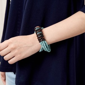 ボリュームのある、ビーズの多連ブレスレット。ナチュラルなウッドパーツがデザインポイントになっています。シックなカラーでまとめているので装いに合わせやすく、スタイリングのアクセント使いにぴったり。ゴムタイプは着け外しもスムーズです。
