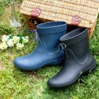一体成型のショートレインブーツ。女性らしいスリムですっきりとしたシルエットがうれしい。履き口にはドット模様のレース付き。