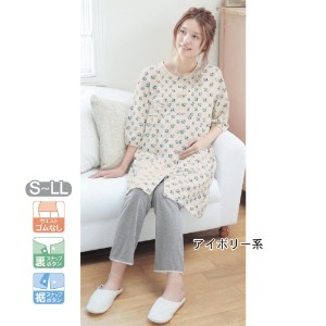 やさしい肌ざわりと締めつけないシルエットでマタニティ期も産後も活躍。ゴムなしのウエストでお腹もラクちん。